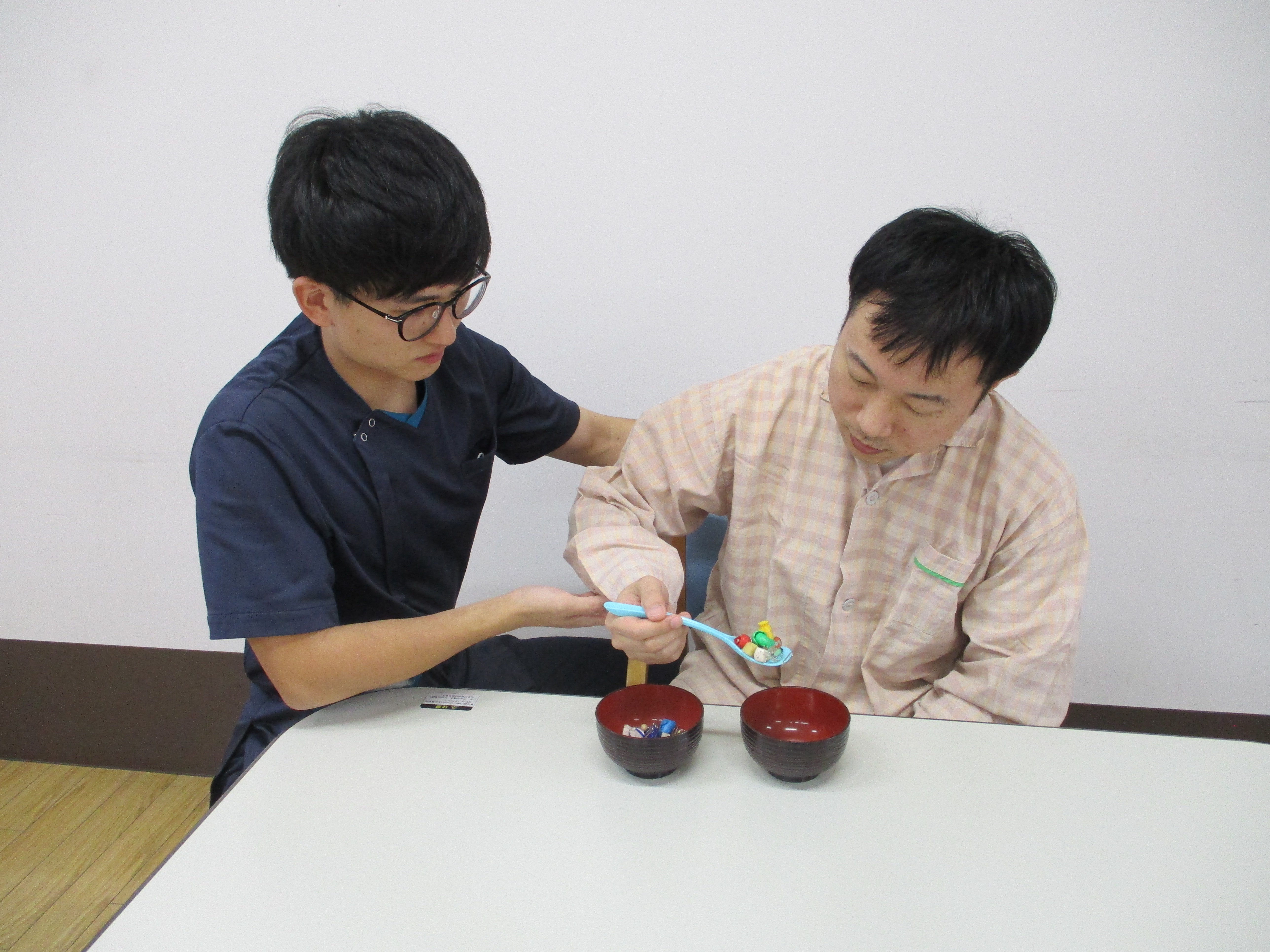 手が動かしづらい患者様に対して箸操作を訓練している風景です。箸を使う動作を訓練し、箸を持ちやすいよう加工してある(自助具)などを使用することもあります。