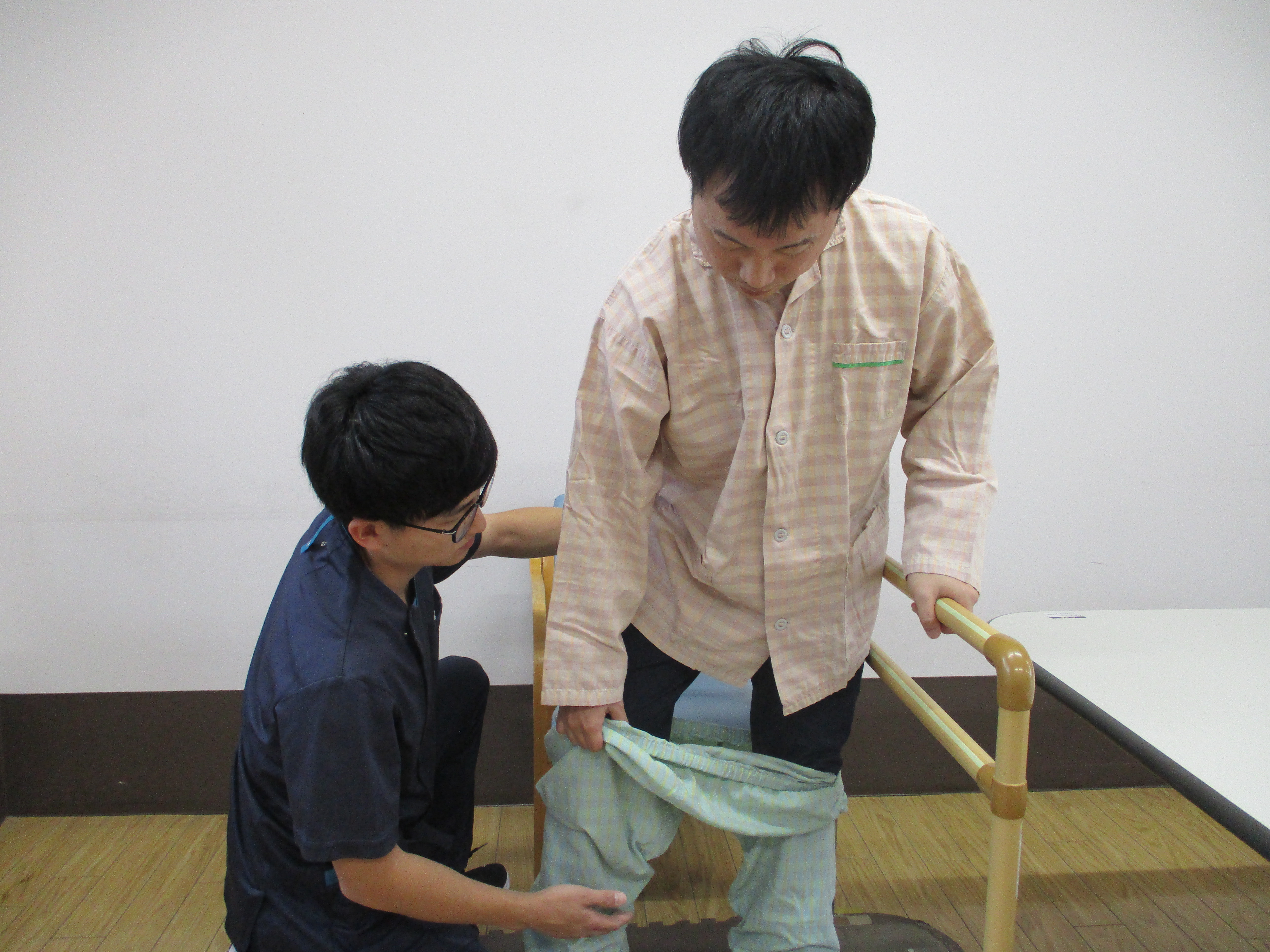 着替えやトイレ動作が行いにくい患者様に対してズボンの着脱を訓練している風景です。患者様の動きに合わせて動作訓練を行います。