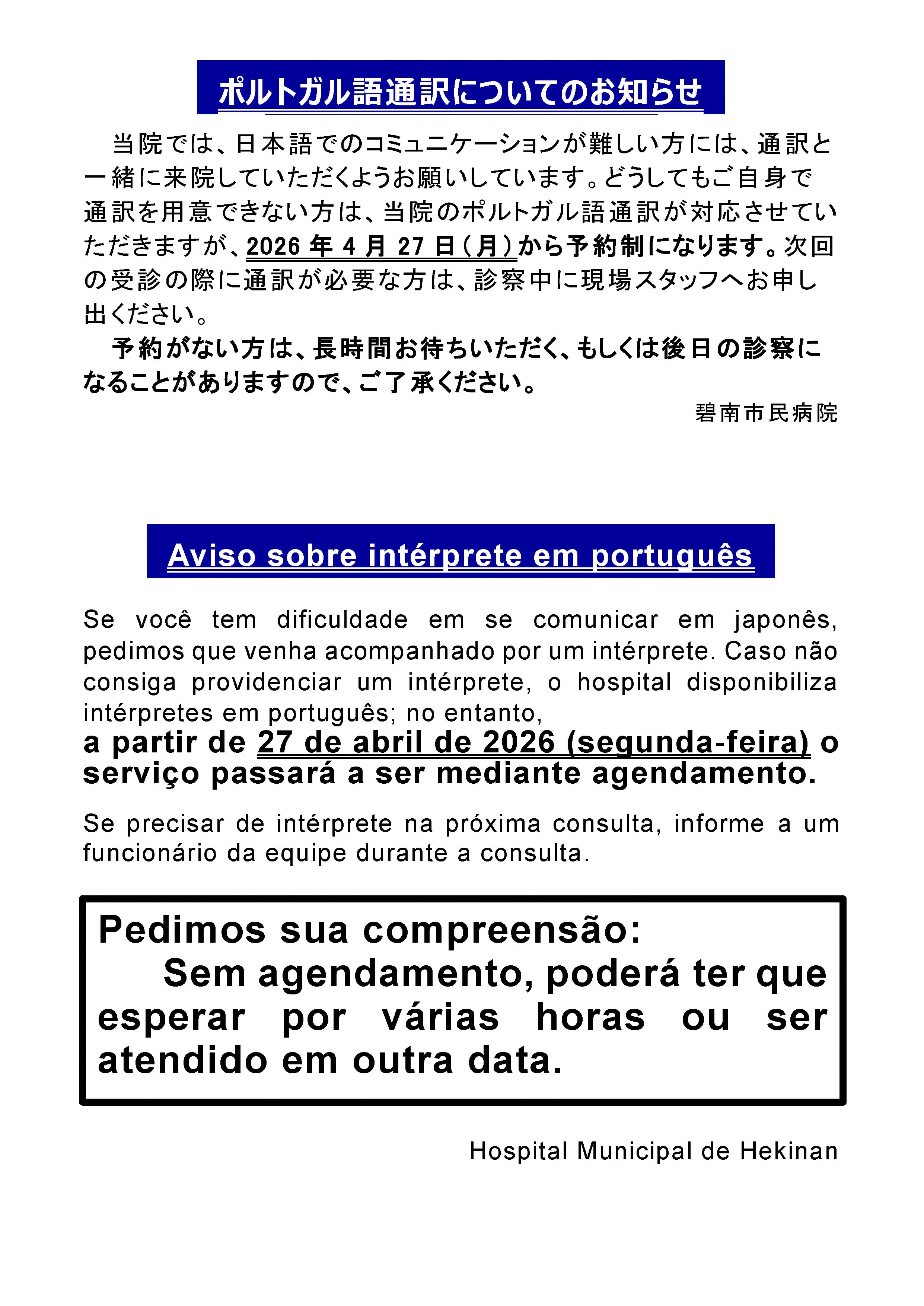 ・緊急で重要な病状説明等が入った場合は予約外でも通訳可能ですが、一般的な外来診療で予約外の通訳は対応していません。
