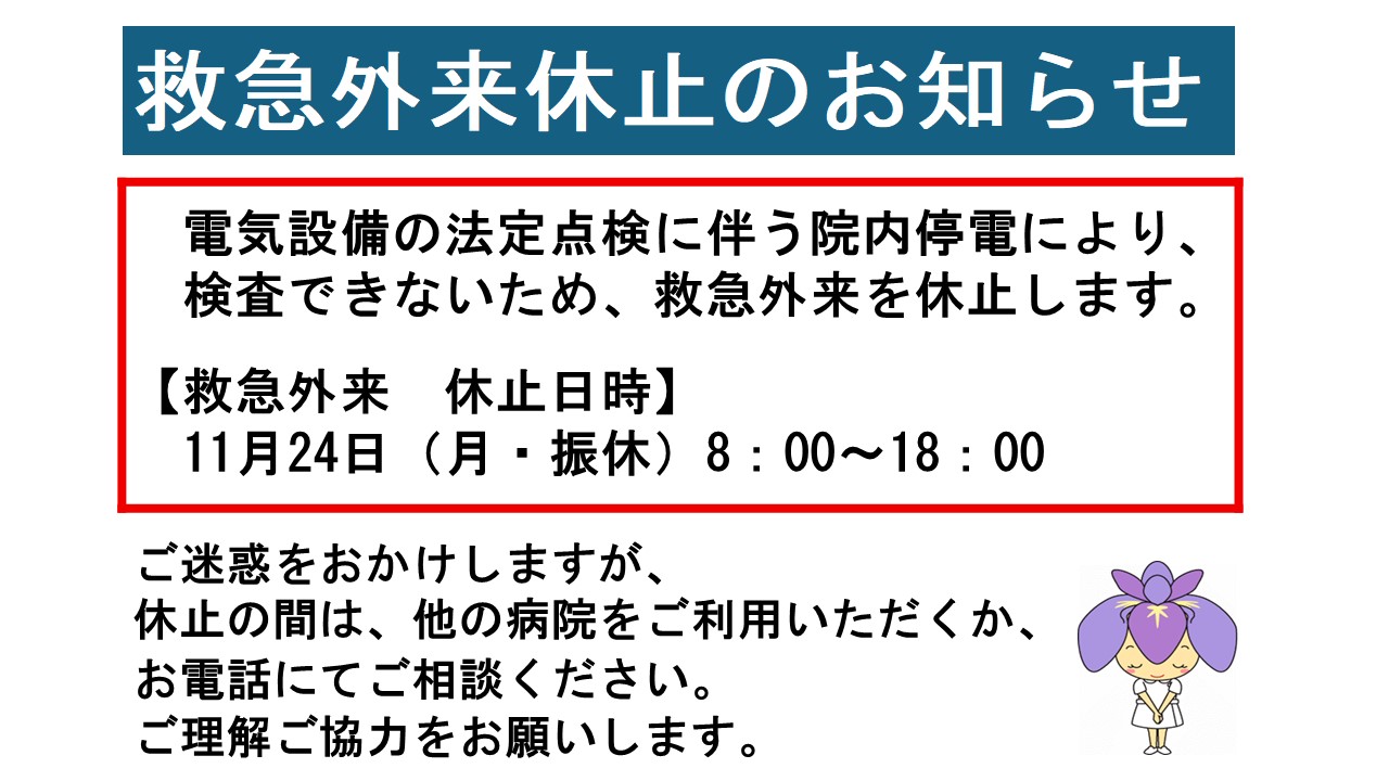 11月24日(月・振休)、停電点検に伴い、救急外来を休止します。