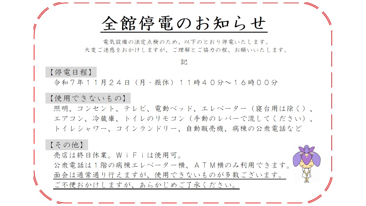 停電に伴い、検査や手術ができないため、以下の日時は当病院の救急外来を休止します。大変ご迷惑をおかけしますが、救急外来をご利用の方は他の病院をご利用下さい。